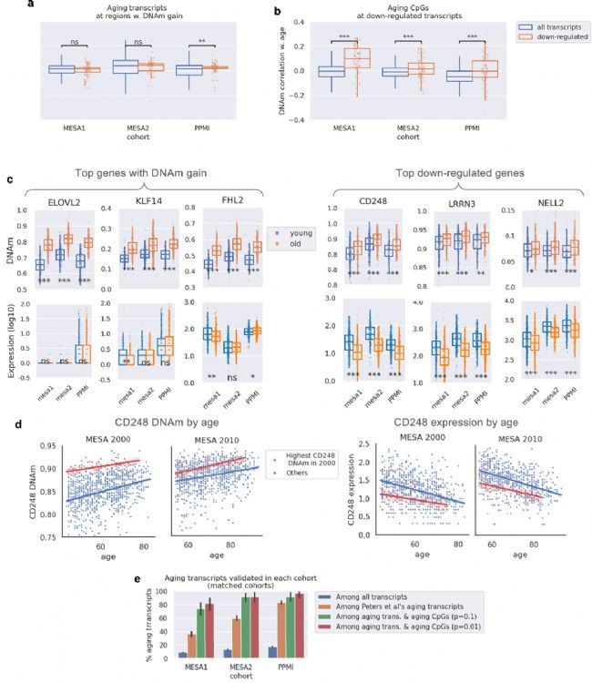 具體而言,ELOVL2、KLF14和FHL2等衰老顯著相關(guān)CpG位點(diǎn)的基因,在年輕(≤45歲)與年老(≥75歲)個體間的表達(dá)水平無顯著差異(圖2c左);而CD248、LRRN3和NELL2等最顯著下調(diào)轉(zhuǎn)錄本則在老年個體中表現(xiàn)出顯著啟動子區(qū)高甲基化(圖2c右)。特別值得注意的是,CD248在MESA兩個時間點(diǎn)及PPMI中均表現(xiàn)出DNAm與衰老的強(qiáng)正相關(guān)和表達(dá)與衰老的強(qiáng)負(fù)相關(guān)(圖2d)。這一模式在MESA兩個時間點(diǎn)和PPMI數(shù)據(jù)集中均成立。