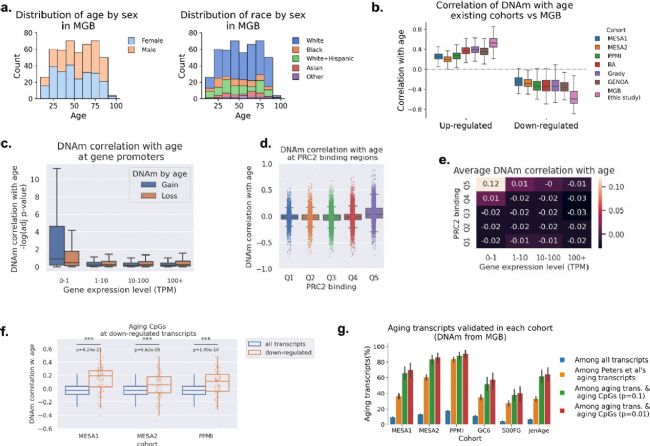 為對鑒定的多組學(xué)衰老基因進(jìn)行獨(dú)立驗(yàn)證,研究利用935k甲基化芯片對Mass General Brigham隊(duì)列的500名個體(MGB500,質(zhì)控后n=461)進(jìn)行DNAm檢測。該隊(duì)列年齡跨度20-90歲,性別和種族分布均衡,可作為血液衰老生物標(biāo)志物的金標(biāo)準(zhǔn)參考數(shù)據(jù)集(圖3a)。
