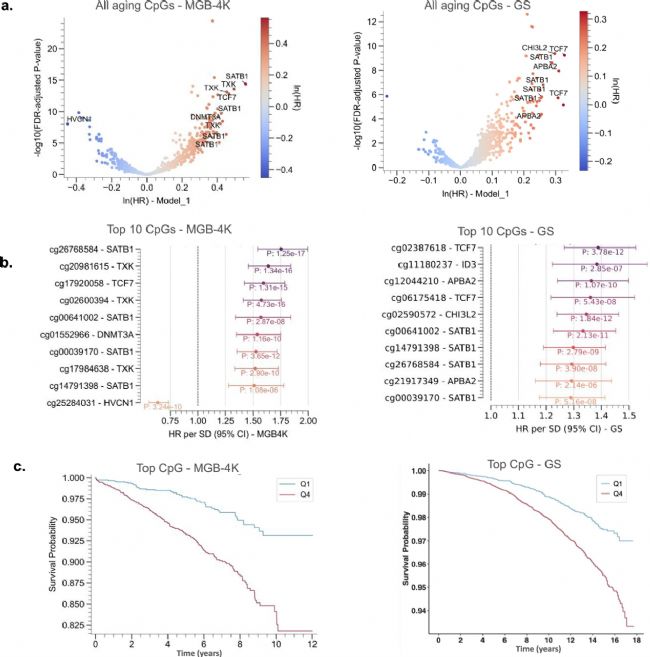 為評估所鑒定多組學(xué)衰老基因的功能相關(guān)性,研究分析了其與衰老相關(guān)結(jié)局(特別是死亡率)的關(guān)聯(lián)。利用包含DNA甲基化和死亡率數(shù)據(jù)的大型數(shù)據(jù)集(MGB-4K和Generation Scotland隊(duì)列),發(fā)現(xiàn)與多組學(xué)衰老基因相關(guān)的CpG位點(diǎn),在兩個隊(duì)列中都與全因死亡風(fēng)險(xiǎn)強(qiáng)相關(guān)(圖4a)。通過多變量Cox比例風(fēng)險(xiǎn)回歸模型(校正年齡和性別),發(fā)現(xiàn)這些基因的CpG位點(diǎn)與死亡風(fēng)險(xiǎn)顯著相關(guān)(圖4b)。