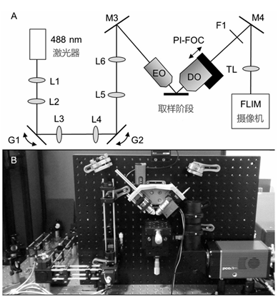 如圖所示,F(xiàn)L-DSLM系統(tǒng)的光學設計(A)一張示意圖和(B)照片。從(A)開始,激光被放大(L1=75毫米,L2=50毫米)并通過掃描系統(tǒng)(L3,L4=50毫米),以創(chuàng)建光片(G1)并提供z運動(G2,與PI-FOC耦合)。然后將光束放大4倍(L5=50毫米,L6=200毫米)并進入光電管以照亮樣品。發(fā)射的熒光通過DO收集,帶通濾波(F1)去除任何散射的激發(fā)光,并使用管狀透鏡(TL=200毫米)聚焦到FLIM 相機上。