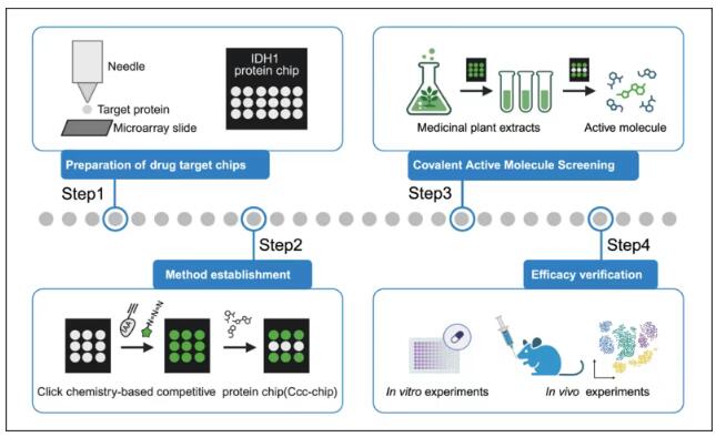 中國(guó)中醫(yī)科學(xué)院醫(yī)學(xué)實(shí)驗(yàn)中心楊洪軍/陳鵬團(tuán)隊(duì)在 iMeta 上發(fā)表研究,開(kāi)發(fā)了一種靈活的 Ccc-Chip 平臺(tái)(蛋白質(zhì)微陣列+生物正交點(diǎn)擊化學(xué)),用于從藥用植物提取物中高通量篩選天然共價(jià)活性分子,并從卡瓦胡椒中鑒定出卡瓦胡椒素 C(Flavokawain C,F(xiàn)lc)作為一種新型的共價(jià) mIDH1 抑制劑。Flc 經(jīng)驗(yàn)證能夠抑制 mIDH1 酶活性,減少原位 2-羥基戊二酸(2-HG)的產(chǎn)生,并增強(qiáng) CD8+ T 細(xì)胞活性。