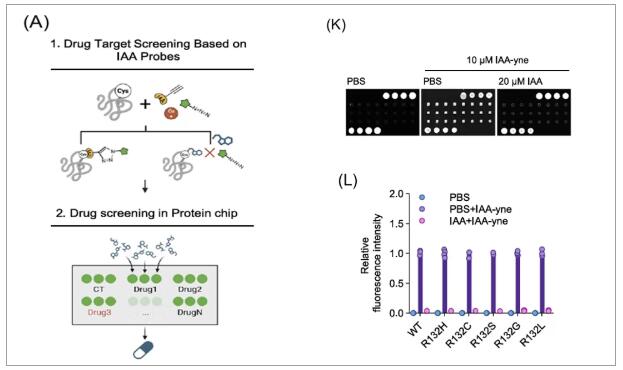 (一)、Ccc-Chip 平臺(tái)驗(yàn)證:該原理基于競(jìng)爭(zhēng)性結(jié)合(圖4A),將靶蛋白固定在芯片上,如果待測(cè)分子能與靶蛋白半胱氨酸共價(jià)結(jié)合,就會(huì)與帶標(biāo)記的探針(IAA-yne)競(jìng)爭(zhēng),導(dǎo)致熒光信號(hào)減弱。研究團(tuán)隊(duì)首先在 P50、AKT1、KRASG12C 等蛋白芯片上驗(yàn)證了方法的可行性,并針對(duì) mIDH1 蛋白芯片系統(tǒng)優(yōu)化了探針濃度、點(diǎn)擊化學(xué)反應(yīng)液和蛋白濃度,為后續(xù)高通量篩選奠定基礎(chǔ)。