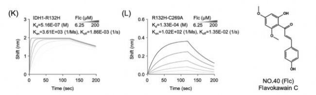 (四)、利用 Gator® BLI 開(kāi)展結(jié)合驗(yàn)證:測(cè)定 Flc(分子量為 300.31 Da)與 IDH1-R132H 的結(jié)合常數(shù)(KD = 0.516 μM),呈現(xiàn)快結(jié)合/慢解離的特征;C269A 位點(diǎn)突變后親和力明顯下降(KD= 133 μM),證實(shí)了 Cys269 是 Flc 的主要結(jié)合位點(diǎn)。Gator® BLI 檢測(cè)流程:使用 SMAP 生物傳感器固化 biotin-IDH1-R132H 或 R132H-C269A 蛋白,結(jié)合不同濃度的 Flc。