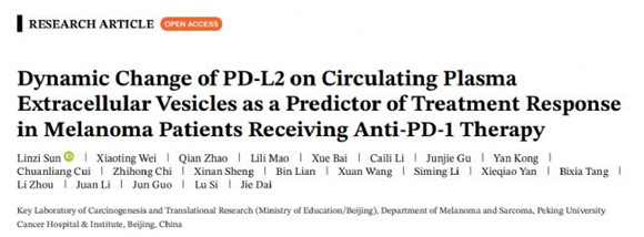 文章題目為“Dynamic Change of PD-L2 on Circulating Plasma Extracellular Vesicles as a Predictor of Treatment Response in Melanoma Patients Receiving Anti-PD-1 Therapy”于2025年2月發(fā)表在Journal of Extracellular Vesicles雜志(IF:16.7),作者來自于北京大學(xué)腫瘤發(fā)生與轉(zhuǎn)化研究教育部重點(diǎn)實(shí)驗(yàn)室。