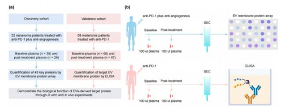 圖1:實(shí)驗(yàn)流程(a)圖為本研究整體技術(shù)路線示意圖。(b)圖為發(fā)現(xiàn)隊(duì)列細(xì)胞外囊泡膜蛋白芯片檢測(cè)示意圖,用于檢測(cè) 45 種關(guān)鍵蛋白的表達(dá)情況;同時(shí)驗(yàn)證隊(duì)列采用酶聯(lián)免疫吸附試驗(yàn)(ELISA),測(cè)定分離所得細(xì)胞外囊泡表面的目標(biāo)蛋白濃度。
