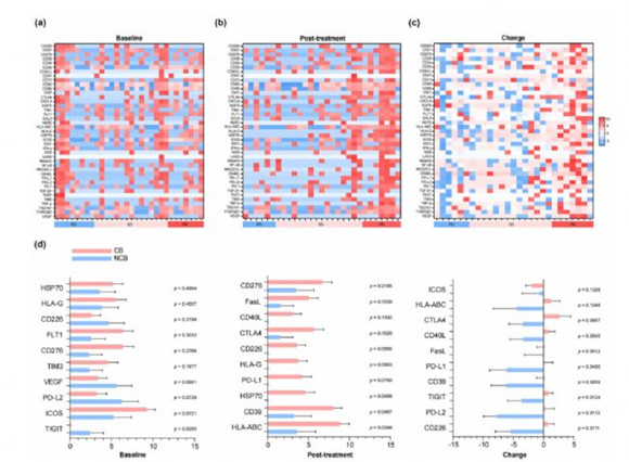 熱圖分別展示了發(fā)現(xiàn)隊(duì)列中每位患者在基線(a)、治療后 4 周(b)兩個(gè)時(shí)間點(diǎn)的細(xì)胞外囊泡蛋白表達(dá)情況,以及蛋白表達(dá)水平從基線到治療后 4 周的變化幅度(c)。(d)圖對(duì)比了臨床受益組(CB)與臨床非受益組(NCB)患者的細(xì)胞外囊泡來源蛋白表達(dá)水平,并呈現(xiàn)了排名前十的差異蛋白柱狀圖。