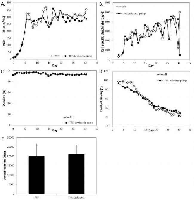 磁力泵TFF和ATF比較,低剪切的磁力離心泵可消除TFF和ATF的性能差異,獲得相近結(jié)果,包括A)VCD、B)LDH檢測所得的特異性細胞死亡率、C)活性、D)產(chǎn)物濾過以及E)培養(yǎng)液中100nm粒徑范圍的顆?倲(shù)。