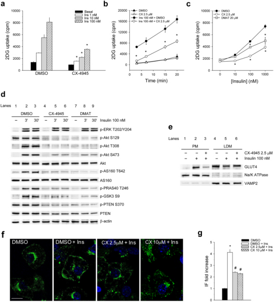 Silmitasertib(CX-4945,AbMole,M1861)被實驗人員用于處理3T3-L1小鼠脂肪細(xì)胞系,目的是抑制CK2激酶活性,研究CK2對胰島素信號通路的影響。結(jié)果顯示在2.5 μM 的CX-4945預(yù)處理1小時后,CX-4945有效抑制了葡萄糖的攝取。并且CX-4945抑制了胰島素誘導(dǎo)的Akt磷酸化(Thr308和Ser473)及其下游底物的磷酸化,減少了GLUT4(葡萄糖轉(zhuǎn)運蛋白)向細(xì)胞膜的轉(zhuǎn)運。