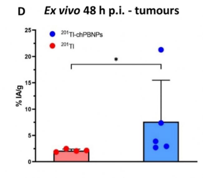 原文Fig. 5D:對比 48 小時時兩組腫瘤組織放射性活度,明確 ²⁰¹Tl-chPBNPs 的腫瘤滯留優(yōu)勢