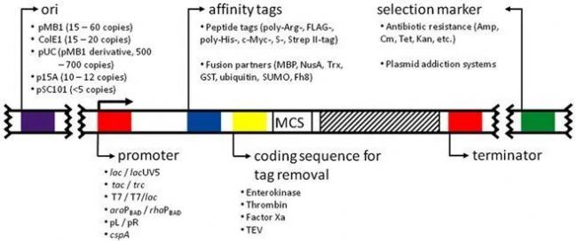 一般來說,重組蛋白表達(dá)質(zhì)粒載體融合了復(fù)制子(Replicon)、啟動(dòng)子(promoter)、親和標(biāo)簽(affinity tags)、篩選標(biāo)記(selection marker)、多克隆位點(diǎn)(MCS)和融合蛋白去除策略(fusion tag removal strategy),如下圖所示:
