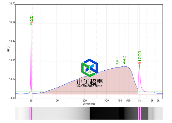 小美超聲的高通量聲波基因組剪切儀在200-500 bp區(qū)間占比達到64.7%,峰圖呈平緩狀,表明基因組片段均一性更好。