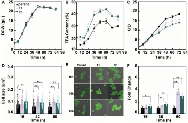在5-L生物反應(yīng)器中,Srcc1過(guò)表達(dá)菌株的總脂肪酸含量、效價(jià)、得率和生產(chǎn)強(qiáng)度較原始菌株分別提升1.20倍、1.27倍、1.27倍和1.42倍,發(fā)酵周期縮短8小時(shí)。最終脂肪酸甲酯(FAME)效價(jià)達(dá)107.28±4.94 g/L,生產(chǎn)強(qiáng)度為1.58±0.07 g/L/h,超越目前已報(bào)道的微生物產(chǎn)脂系統(tǒng)(包括裂殖壺菌、解脂耶氏酵母等底盤)。
