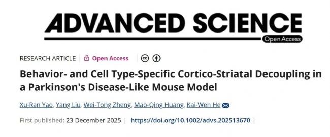 近日,中國科學院上海有機化學研究所生物與化學交叉研究中心何凱雯課題組在Advanced Science期刊發(fā)表了題為“Behavior- and Cell Type-Specific Cortico-Striatal Decoupling in a Parkinson’s Disease-Like Mouse Model”的研究論文,為理解早期帕金森病的耦合異常及機制提供了見解。