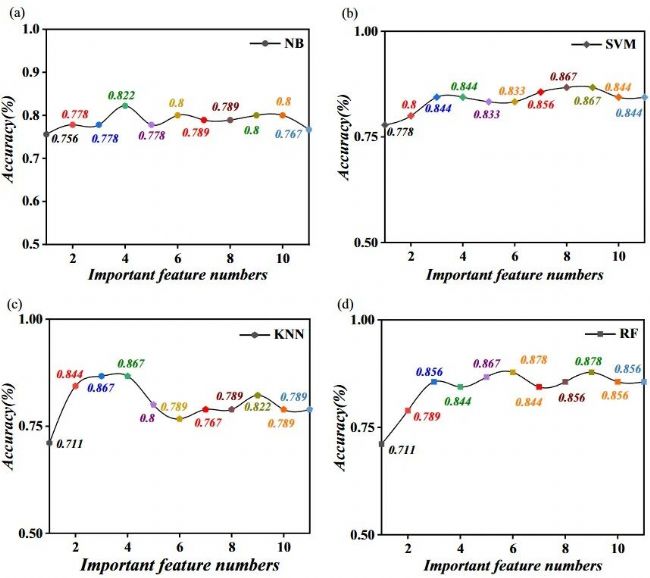 圖6. 四種分類器的準(zhǔn)確率與關(guān)鍵特征數(shù)量的關(guān)系。(a) 樸素貝葉斯(NB);(b) 支持向量機(jī)(SVM);(c) K 近鄰(KNN);(d) 隨機(jī)森林(RF)