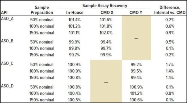 該方法已成功轉(zhuǎn)移至CMO,并在GMP藥品生產(chǎn)中實(shí)施。圖6顯示,四種不同ASO的內(nèi)部檢測(cè)結(jié)果與CMO結(jié)果的含量回收率差異均< 2.0%,證實(shí)了方法的良好重現(xiàn)性。