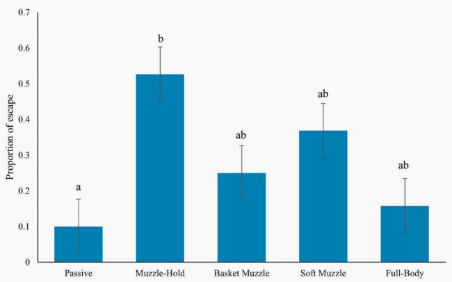 那么,是什么因素導致狗狗在檢查中感到恐懼呢?影響恐懼的一個潛在壓力源是獸醫(yī)檢查期間采用的處理技術。長期以來,臨床上常使用如“全身束縛”等高度限制性的手段來確保操作安全,但這種物理限制本身就是已知的強烈壓力源。為了改善這一現(xiàn)狀,低應激處理方法被提出,提倡使用限制性最小的技術,并根據(jù)狗狗的行為反應調整約束方式。本文介紹的作者研究了不同約束技術和工具對狗狗行為的影響,并比較不同約束技術和工具下的狗狗恐懼評分。