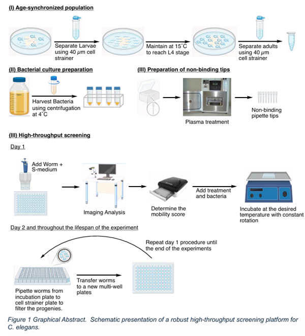 在本研究中,我們開發(fā)了一個新平臺,用于在沒有任何化學(xué)試劑或基因干預(yù)的情況下,在液體培養(yǎng)中長期維持年齡同步的秀麗隱桿線蟲(C. elegans)種群,以進(jìn)行高通量(HT)篩選(圖1)。該方案從預(yù)先在固體線蟲生長培養(yǎng)基(NGM)上培養(yǎng)的第1天成蟲開始。與傳統(tǒng)方法不同,該方法不需要漂白處理,從而避免了漂白可能引起的表型變化,并支持線蟲使用活性和非活性食物來源,從而能夠在嚴(yán)格控制的環(huán)境中進(jìn)行基因和化合物篩選。