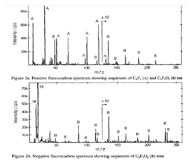 · 正譜圖中觀察到的CₓFᵧ系列碎片離子表明表面存在氟碳化合物