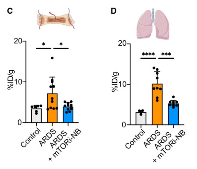 原文Fig. 5D標(biāo)注:柱狀圖量化顯示 ARDS 模型中各組肺部 ¹⁸F-FDG 攝取差異,明確 mTORi-nanobiologics 可有效逆轉(zhuǎn)肺部過度炎癥。