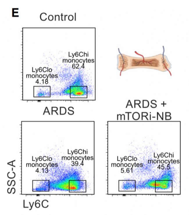 原文Fig. 5E:流式細(xì)胞術(shù)分析圖及量化結(jié)果,顯示 mTORi-nanobiologics 可顯著降低 ARDS 模型小鼠骨髓 Ly6C⁺單核細(xì)胞數(shù)量,為制劑調(diào)控髓系細(xì)胞增殖、抑制炎癥的核心結(jié)論提供直接依據(jù)。