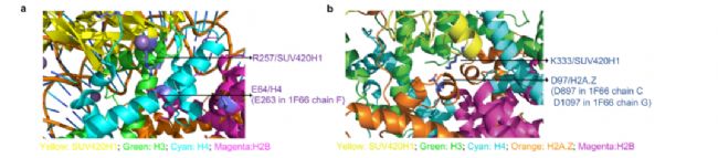 (a) R257/ SUV420H1和E64/ H4相互作用 (b) K333 /SUV420H1和D97/ H2A.Z相互作用