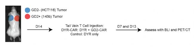 方法: 小鼠進(jìn)行肩部皮下異體腫瘤移植: 小鼠:免疫缺陷的人源化的 NSG mice; 腫瘤為:GD2+腫瘤(143b 人骨肉瘤) 和 GD2-對(duì)照腫瘤(HCT116 人結(jié)腸癌細(xì)胞) 對(duì)比; 腫瘤生長(zhǎng) 14天后從尾靜脈注射 DYR-CAR T cell 或 control DYR-only T cell; 在 T cell 注射之后的第 7 天和第 13 天成像,開始是尾靜脈注射腔腸素后進(jìn)行生物發(fā)光成像(BLI),然后尾靜脈注射[18F]-TMP 進(jìn)行 PET/CT 成像。