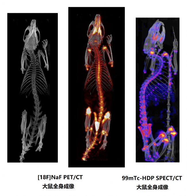 圖 12. PET 單床 FOV 和 SPECT 多床 FOV 可做整只大鼠的全身成像。