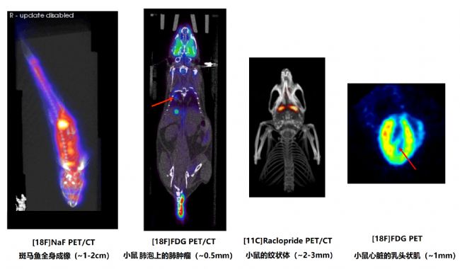 圖 13.高分辨率 PET,可觀察到細(xì)微結(jié)構(gòu),如斑馬魚的脊柱、小鼠肺泡上的腫瘤、小鼠的紋狀體和心臟的乳頭狀肌結(jié)構(gòu)【2】 。