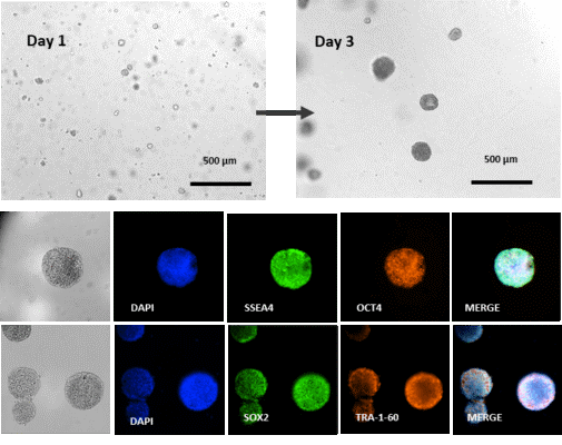 圖7 3D hPSC 球狀體中關(guān)鍵多能標(biāo)記物的表達。(上)3天后,形成約100 μM的hPSC球狀體。(下)高質(zhì)量的hPSC球狀體在3 d內(nèi)形成,并表達關(guān)鍵的多能性標(biāo)志物SSEA4、OCT4、SOX2和TRA-1-60。