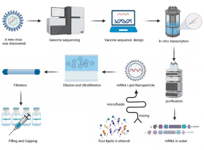 mRNA 疫苗的設(shè)計(jì)取決于目標(biāo)病原體抗原序列的定義。通過確定目標(biāo)抗原并優(yōu)化其編碼序列,mRNA 可以通過 RNA 聚合酶在體外轉(zhuǎn)錄。合成的 mRNA 通過不同的工藝純化,然后使用微流控技術(shù)與脂質(zhì)相混合并封裝成 mRNA‑脂質(zhì)納米顆粒 (mRNA‑LNP) 復(fù)合物。隨后,通過稀釋和超濾濃縮完成 LNP 的自組裝。最后,經(jīng)過無菌過濾、灌裝和封蓋,即可獲得 mRNA 疫苗。