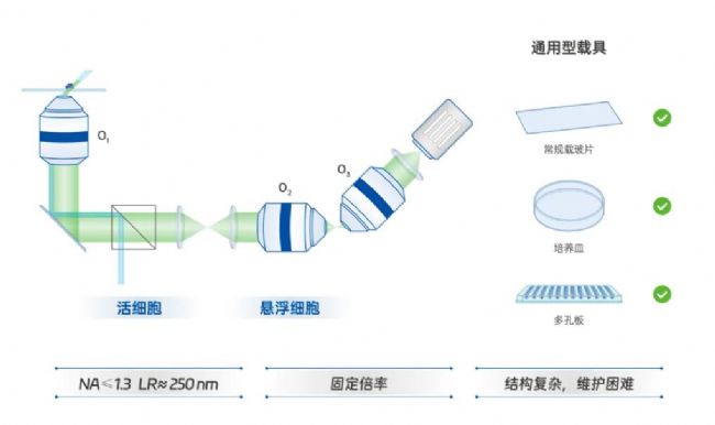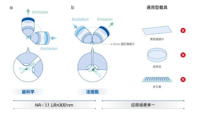 2. 無法適配常規(guī)載具:操作空間受限,傳統(tǒng)正交物鏡的樣品必須懸空固定,無法使用常規(guī)載玻片或培養(yǎng)皿。正置 V 形雙物鏡的載具只能是 5 mm 圓形薄玻片,常規(guī)載玻片、培養(yǎng)皿和孔板不能適配。