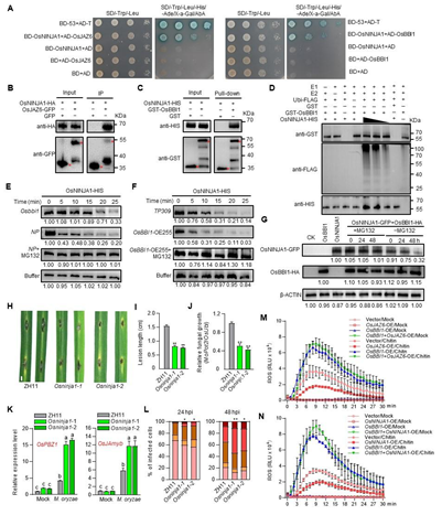 圖4. OsBBI1和OsJAZ6與OsNINJA1相互作用,且OsBBI1抑制OsJAZ6和OsNINJA1的負(fù)向免疫功能。