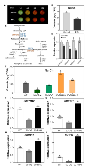 本研究通過外源EBL處理番茄果實(shí),結(jié)合高效液相色譜(HPLC)檢測(cè)果實(shí)表皮類黃酮(以NarCh為指標(biāo))含量及實(shí)時(shí)熒光定量PCR(RT-qPCR)檢測(cè)類黃酮相關(guān)基因(SlMYB12、SlCHS1、SlCHS2、SlF3'H)表達(dá),結(jié)果顯示外源EBL處理能顯著抑制番茄果皮類黃酮的積累。然后進(jìn)一步構(gòu)建了BR生物合成限速酶基因SlCYP90B3的過表達(dá)和RNA干擾系進(jìn)行驗(yàn)證,結(jié)果表明內(nèi)源BR通過SlCYP90B3負(fù)調(diào)控類黃酮合成。