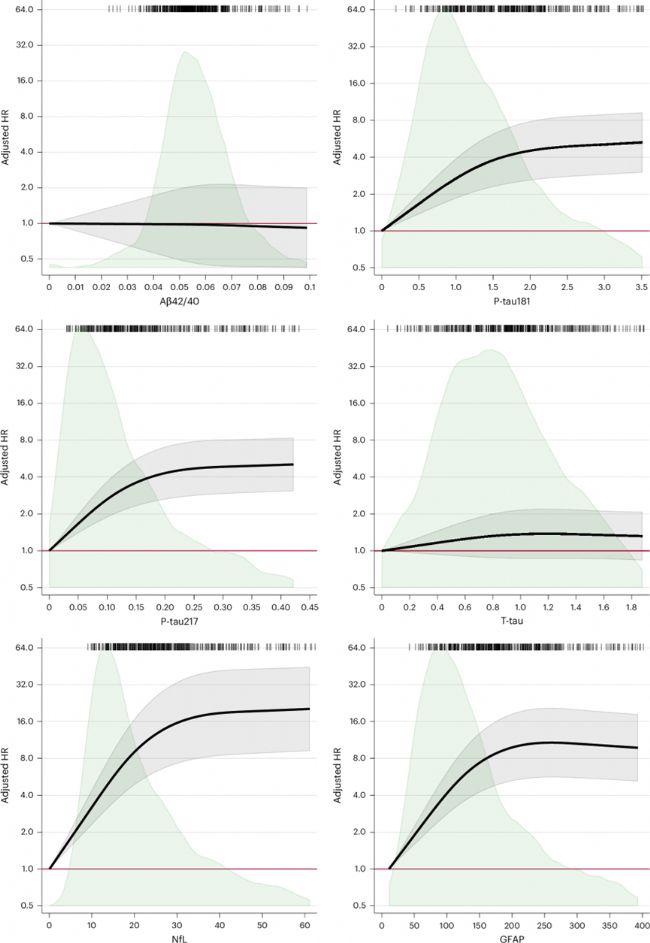 在一個由2148名來自瑞典的無癡呆老年人組成的隊列中(隨訪時間長達(dá)16年),評估了六種AD血液生物標(biāo)志物——淀粉樣蛋白β42與淀粉樣蛋白β40的比值以及T217位點磷酸化tau(p-tau217)、T181位點磷酸化tau(p-tau181)、總tau、神經(jīng)絲輕鏈(NfL)和膠質(zhì)纖維酸性蛋白(GFAP)的水平——對于偶發(fā)全因癡呆和AD癡呆的風(fēng)險比和預(yù)測性能。在多變量調(diào)整的Cox回歸模型中,基線p-tau181、p-tau217、NfL和GFAP水平升高與全因癡呆和AD癡呆的風(fēng)險顯著增加相關(guān),并顯示出非線性的劑量-反應(yīng)關(guān)系。p-tau181、p-tau217、NfL和GFAP濃度升高對10年內(nèi)全因癡呆和AD癡呆的發(fā)生表現(xiàn)出強大的預(yù)測性能,其陰性預(yù)測值超過90%。將p-tau217與NfL或GFAP組合進(jìn)一步改善了預(yù)測,使陽性預(yù)測值達(dá)到43%。研究結(jié)果表明,這些生物標(biāo)志物有潛力在社區(qū)環(huán)境中排除即將發(fā)生的癡呆,但可能需要與其他生物學(xué)或臨床標(biāo)志物結(jié)合才能用作篩查工具。