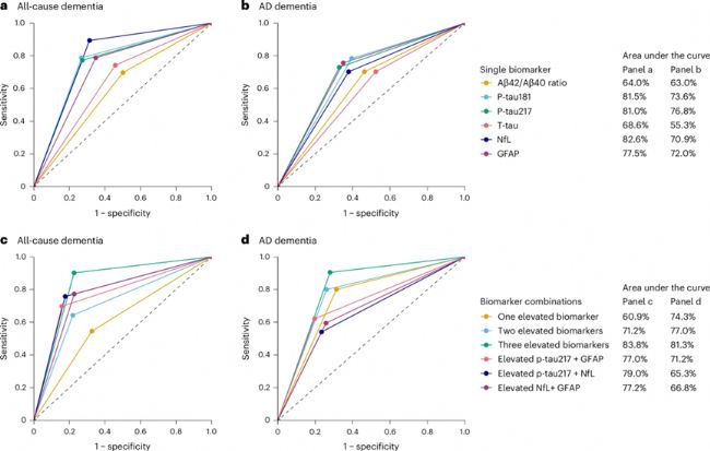 基于p-tau217、NfL和GFAP多種生物標(biāo)志物水平升高來檢測未來10年全因和AD癡呆的預(yù)測性能,對于全因癡呆的AUC值分別為60.9%、71.1%和83.8%,對于AD癡呆的AUC值分別為74.3%、77.0%和81.3%。當(dāng)研究特定的生物標(biāo)志物組合時:
