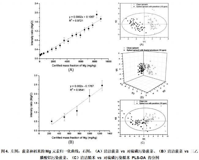 美韓科研團(tuán)隊運(yùn)用LIBS技術(shù),對菠菜和大米中的關(guān)鍵營養(yǎng)元素(Mg、Ca、Na、K)開展快速定量分析;同時結(jié)合化學(xué)計量學(xué)方法,實(shí)現(xiàn)了農(nóng)藥污染與未污染農(nóng)產(chǎn)品(菠菜、大米)的快速區(qū)分,有效解決了傳統(tǒng)方法難以鑒別農(nóng)藥污染的問題。盡管農(nóng)藥所含元素與農(nóng)產(chǎn)品自身元素存在重疊,無法通過單一元素檢測鑒別污染,但PLS-DA方法可借助LIBS光譜的多元素發(fā)射線分布特征,高效區(qū)分污染與未污染樣品。其中,清潔菠菜的誤分類率為0%,10 ppm農(nóng)藥污染菠菜的誤分類率僅為2%,且該方法對硫磷、三乙膦酸鋁污染均適用,充分驗(yàn)證了此項技術(shù)的實(shí)用性。