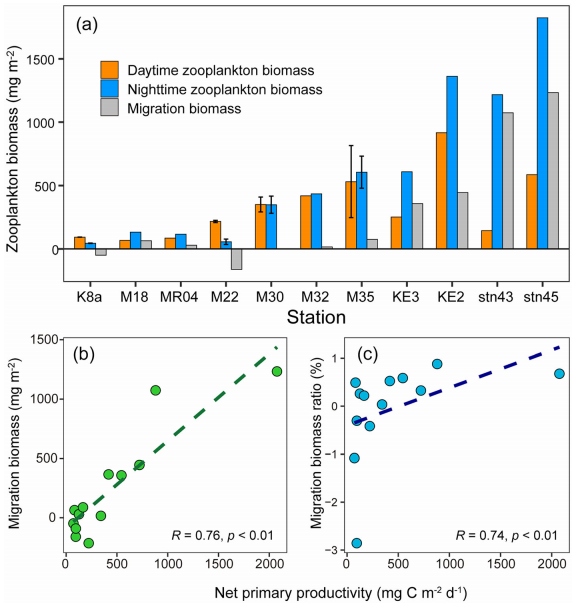 本研究首次在北太平洋西部海域闡明,初級生產(chǎn)力是調(diào)控浮游動物DVM強度及其碳輸出效率的核心環(huán)境因子。