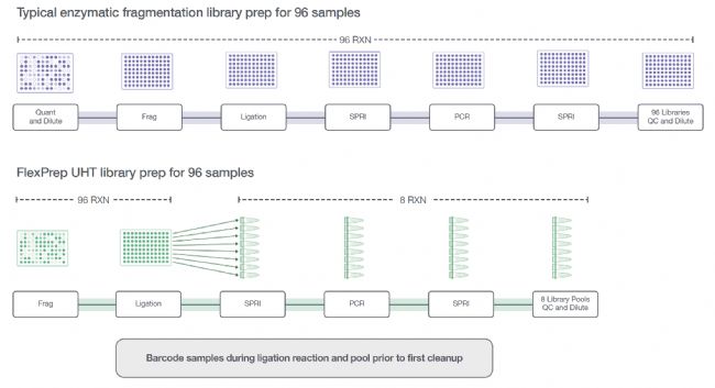 Twist 公司的FlexPrep™ 超高通量(UHT)文庫(kù)制備與雜交捕獲試劑盒憑借兩項(xiàng)核心創(chuàng)新,能有效應(yīng)對(duì)上述挑戰(zhàn)。首先,Normalization by Ligation™(NBL)技術(shù)消除了在文庫(kù)制備前對(duì)每個(gè)DNA樣本進(jìn)行定量和均一化(normalization)的要求,即能夠?qū)⒉煌鹗剂康拇郎y(cè)樣本穩(wěn)定轉(zhuǎn)化為可測(cè)序文庫(kù);其次,在文庫(kù)構(gòu)建流程的前期便引入分子標(biāo)簽(barcode),使樣本在連接反應(yīng)后即可直接混合(pooling),從而大幅減少后續(xù)的實(shí)驗(yàn)流程步驟和反應(yīng)體系,所需的耗材和試劑用量可節(jié)省高達(dá)12倍。這些創(chuàng)新設(shè)計(jì)使得每個(gè)靶向捕獲反應(yīng)可同時(shí)支持96個(gè)樣品,在顯著降低試劑消耗與人工操作時(shí)間的同時(shí),充分提升了測(cè)序平臺(tái)的運(yùn)行效率。