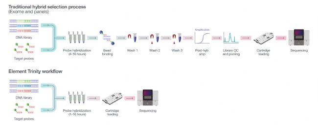 在完成自動(dòng)化文庫(kù)構(gòu)建和質(zhì)控(QC)后,實(shí)驗(yàn)人員使用Element Biosciences公司的 Trinity™產(chǎn)品技術(shù),可直接在測(cè)序儀芯片上自動(dòng)完成探針雜交和捕獲。這種邊測(cè)序邊雜交的方式避免了傳統(tǒng)雜交捕獲方法中涉及到的磁珠捕獲、多次洗滌及雜交后擴(kuò)增,降低了流程復(fù)雜度和操作時(shí)間,從而提高了儀器的利用效率。基于Twist Bioscience公司的靶向富集panel,SPT Labtech–Twist–Element三方協(xié)作流程實(shí)現(xiàn)了高效集成的高質(zhì)量靶向測(cè)序,可在大規(guī)模樣本隊(duì)列中確保測(cè)序結(jié)果的穩(wěn)定和覆蓋度的均一性。