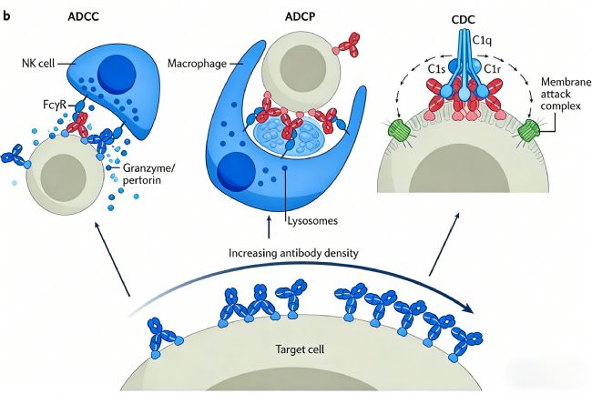 抗體依賴的細(xì)胞介導(dǎo)的細(xì)胞毒性作用(ADCC)及抗體依賴的細(xì)胞吞噬作用(ADCP)是Fc段介導(dǎo)的效應(yīng)功能。抗體結(jié)合靶細(xì)胞表面抗原后,其Fc段與自然殺傷(NK)細(xì)胞或巨噬細(xì)胞表面的Fcγ受體結(jié)合,激活效應(yīng)細(xì)胞殺傷靶細(xì)胞。該機(jī)制是抗腫瘤抗體(如利妥昔單抗、曲妥珠單抗)發(fā)揮療效的核心途徑之一。
